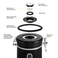 Der Aromadeckel verfügt über eine integrierte Datumsanzeige – ideal zur Kontrolle der Frische – sowie über ein Einwegventil, das Luft nach aussen entweichen lässt und gleichzeitig das Eindringen von Sauerstoff verhindert. So bleiben Aromen länger erhalten und Ihre Lebensmittel bestens geschützt.