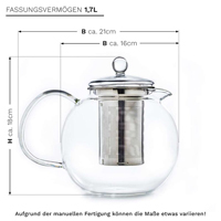 Herstellung und Material: Die Teekanne mit Glasdeckel besteht aus hitzebeständigem Borosilikatglas, der herausnehmbare Filter aus hochwertigem Edelstahl. Geeignet für Stövchen, Spülmaschine und Mikrowelle.