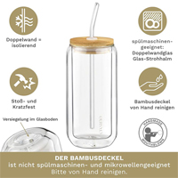 Creano Doppelwandiges Trinkglas 360 ml: Stilvoll, nachhaltig, mit Bambusdeckel und Strohhalm