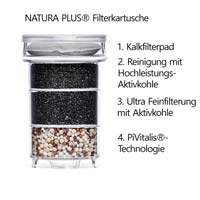 Das Wasser läuft durch die NATURA PLUS® Filterkartusche über 3 getrennte Schichten und wird so von unerwünschten Schadstoffen wie Chlor, Blei, Kupfer usw. befreit. Im untersten Teil des Filters wird das Wasser wieder leicht mineralisiert.