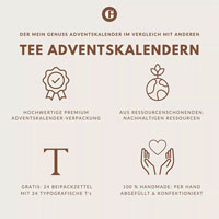Die perfekte kulinarische Reise mit dem 24er Tee Geschenkset: Genussvoll eintauchen in die Welt des Tees. Der edle Tee-Kalender lädt mit seinen 24 exklusiven Teespezialitäten zu einer Reise in verschiedene Kulturen ein. Er öffnet die Türen zu unterschiedlichen Geschmacksrichtungen, Aromen und Düften - ganz besonders zur Adventszeit oder zu Weihnachten, aber auch zu vielen anderen Anlässen.
